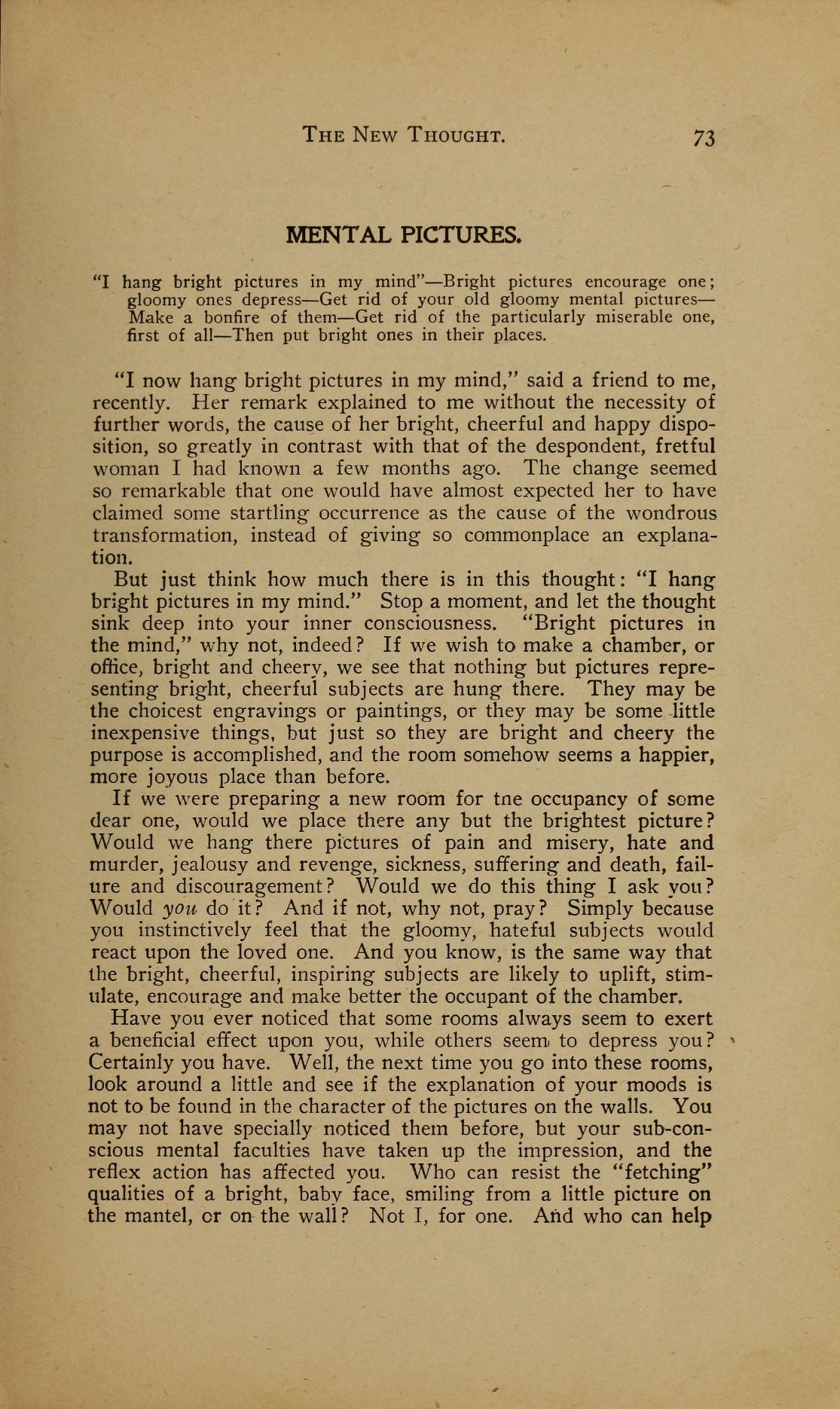 But just think how much there is in this thought: "I hang bright pictures in my mind." Stop a moment, and let the thought sink deep into your inner consciousness. "Bright pictures in the mind," why not, indeed? If we wish to make a chamber, or office, bright and cheery, we see that nothing but pictures representing bright, cheerful subjects are hung there. They may be the choicest engravings or paintings, or they may be some little inexpensive things, but just so they are bright and cheery the purpose is accomplished, and the room somehow seems a happier, more joyous place than before.