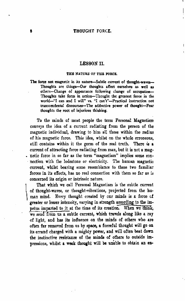The force not magnetic in its nature - Subtle current of thought waves - Thoughts are things - Our thoughts affect ourselves as well as others - Change of appearance following change of occupation - Thought the greatest force in the world - "I can and I will" vs. "I can't" - Practical instruction not transcendental discourse - The adductive power of thought - Fear thought the root of injurious thinking.