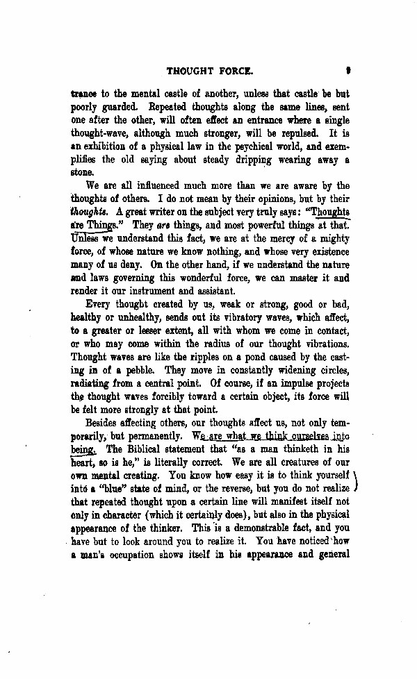 We are all influenced much more than we are aware by the thoughts of others. I do not mean by their opinions but by their thoughts. A great writer on this subject very truly says: "thoughts are things." They are things, and most powerful things at that. Unless we understand this fact, we are at the mercy of a mighty force, of whose nature we know nothing, and whose very existence many of us deny. On the other hand, if we understand the nature and laws governing this wonderful force, we can master it and render it our instrument and assistant. Every thought created by us, weak or strong, good or bad, healthy or unhealthy, sends out its vibratory waves, which affect, to a greater or lesser extent all with whom we come in contact, or who may come within the radius of our thought vibrations. Thought waves are like the ripples on a pond caused by the casting in of a pebble, they move in constantly widening circles, radiating from a central point. Of course, if an impulse projects the thought waves forcibly toward a certain object, its force will be felt more strongly at that point.