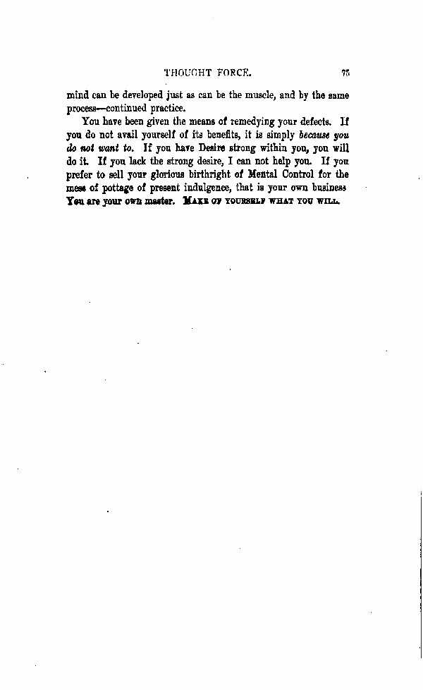 You have been given the means of remedying your defects. If you do not avail yourself of its benefits, it is simply because you do not want to. If you have Desire strong within you, you will do it. If you lack the strong desire, I cannot help you. If you prefer to sell your glorious birthright of Mental Control for the mess of pottage of present indulgence, that is your own business. You are your own master.
