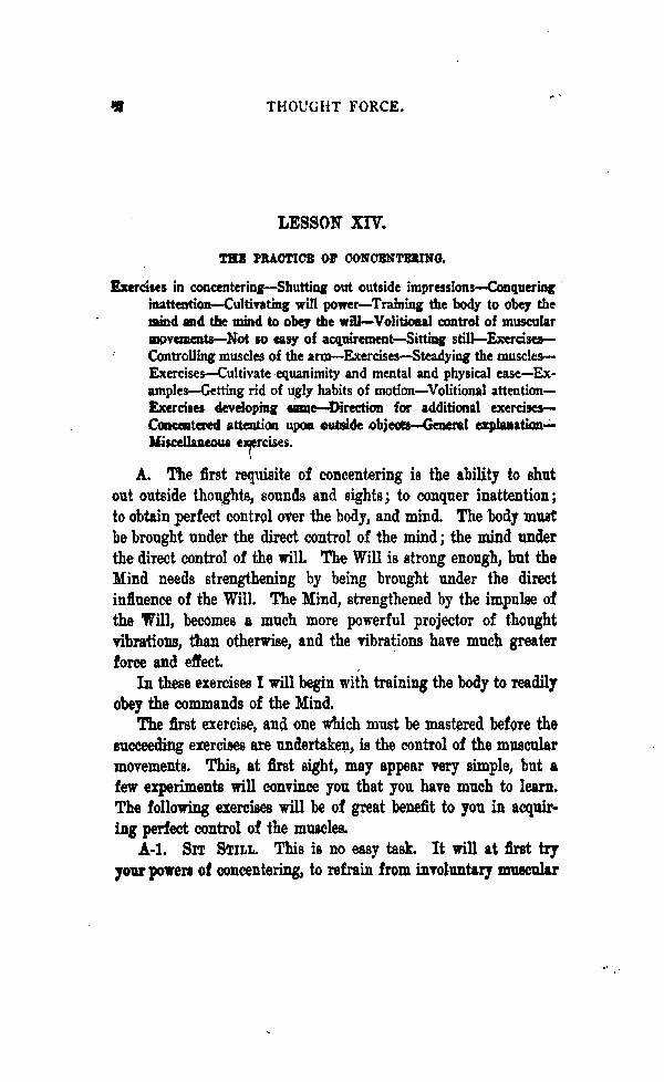 Exercises in the concentering - Shutting out outside impressions - Conquering inattention - Cultivating will power - Training the body to obey the will - Volitional control of muscular movements - Not so easy of acquirements - Sitting still exercises - Controlling muscles of the arm --- Exercises - Steadying the muscles - Exercises - Cultivate equanimity and mental and physical ease - Examples-Getting rid of ugly habits of motion - Volitional attention - Exercises developing same - Direction for additional exercise - Concentered attention upon outside object - General explanation - Miscellaneous exercises.