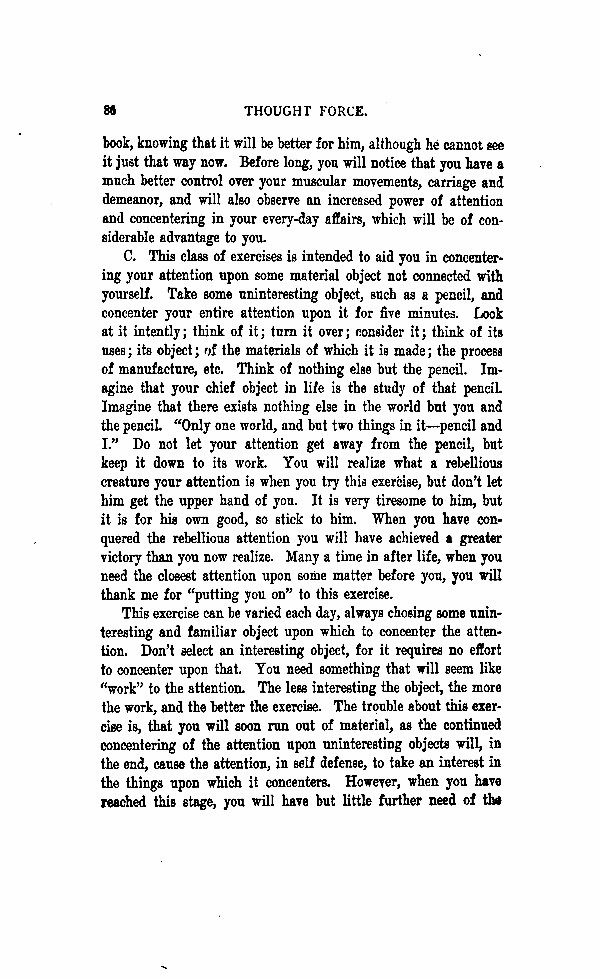 C. This class of exercises is intended to aid you in concentering your attention upon some material object not connected with yourself. Take some uninteresting object, such as a pencil, and concenter your entire attention upon it for five minutes. Look at it intently; everything of it; turn it over; consider it; think of its uses; its objects; of the materials of which it is made; the process of manufacturing, etc. Think of nothing else but the pencil. Imagine that your chief object in life is the study of that pencil. Imagine that there exists nothing else in the world but you and the pencil. "Only one world, and but two things in it, the pencil and I." Do not let your attention get away from the pencil, but keep it down to its work. You will realize what a rebellious creature your attention is when you try this exercise, but don't let him get the upper hand of you. It is very tiresome to him, but it is for his own good, so stick to it. When you have conquered the rebellious attention you will have achieved a greater victory that you now realize. Many a time in after life, when you need the closest attention upon some matter before you, you will thank me for "putting you on" to this exercise.