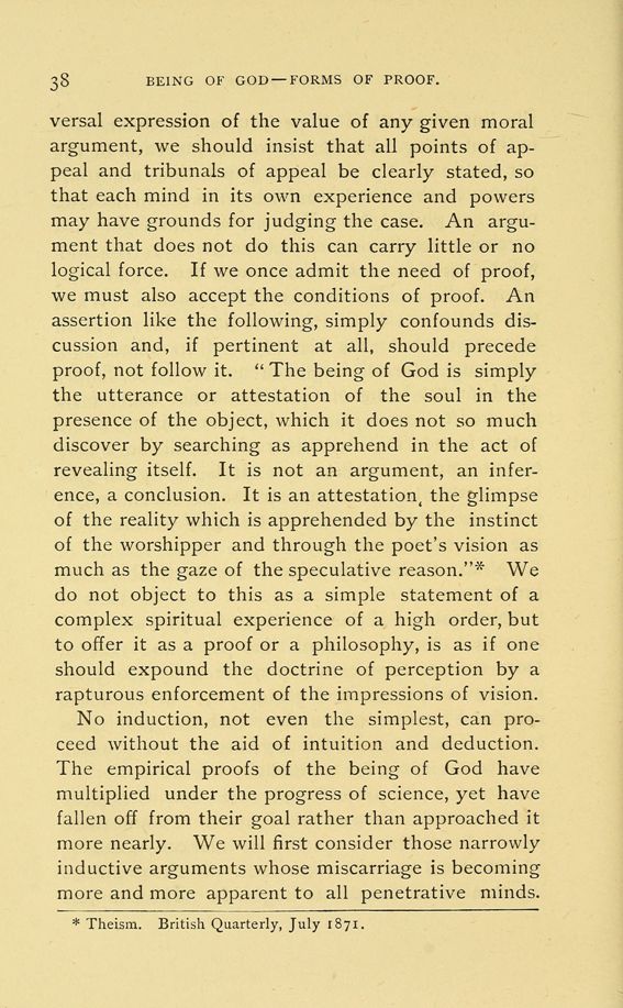 expression of the value of any given moral argument, we should insist that all points of appeal and tribunals of appeal be clearly stated, so that each mind in its own experience and powers may have grounds for judging the case. An argument that does not do this can carry little or no logical force. If we once admit the need of proof, we must also accept the conditions of proof. An assertion like the following, simply confounds discussion and, if pertinent at all, should precede proof, not follow it. "The being of God is simply the utterance or attestation of the soul in the presence of the object, which it does not so much discover by searching as apprehend in the act of revealing itself. It is not an argument, an inference, a conclusion. It is an attestation, the glimpse of the reality which is apprehended by the instinct of the worshipper and through the poet's vision as much as the gaze of the speculative reason."* We do not object to this as a simple statement of a complex spiritual experience of a high order, but to offer it as a proof or a philosophy, is as if one should expound the doctrine of perception by a rapturous enforcement of the impressions of vision.