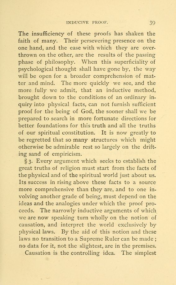 The insufficiency of these proofs has shaken the faith of many. Their persevering presence on the one hand, and the ease with which they are overthrown on the other, are the results of the passing phase of philosophy. When this superficiality of psychological thought shall have gone by, the way will be open for a broader comprehension of matter and mind. The more quickly we see, and the more fully we admit, that an inductive method, brought down to the conditions of an ordinary inquiry into physical facts, can not furnish sufficient proof for the being of God, the sooner shall we be prepared to search in more fortunate directions for better foundations for this truth and all the truths of our spiritual constitution. It is now greatly to be regretted that so many structures which might otherwise be admirable rest so largely on the drifting sand of empiricism.