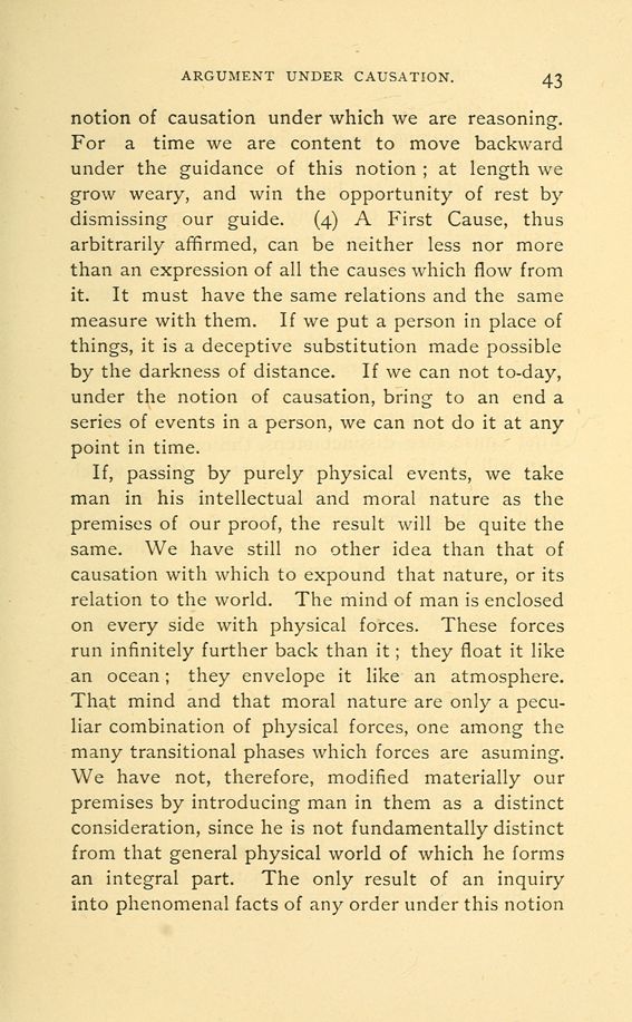 If, passing by purely physical events, we take man in his intellectual and moral nature as the premises of our proof, the result will be quite the same. We have still no other idea than that of causation with which to expound that nature, or its relation to the world. The mind of man is enclosed on every side with physical forces. These forces run infinitely further back than it; they float it like an ocean; they envelope it like an atmosphere. That mind and that moral nature are only a peculiar combination of physical forces, one among the many transitional phases which forces are assuming. We have not, therefore, modified materially our premises by introducing man in them as a distinct consideration, since he is not fundamentally distinct from that general physical world of which he forms an integral part. The only result of an inquiry into phenomenal facts of any order under this notion