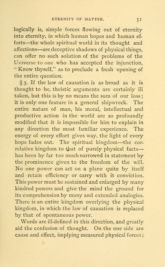 § 3. If the law of causation is as broad as it is thought to be, theistic arguments are certainly ill taken, but this is by no means the sum of our loss; it is only one feature in a general shipwreck. The entire nature of man, his moral, intellectual and productive action in the world are so profoundly modified that it is impossible for him to explain in any direction the most familiar experience. The energy of every effort gives way, the light of every hope fades out. The spiritual kingdom --- the correlative kingdom to that of purely physical facts --- has been by far too much narrowed in statement by the prominence given to the freedom of the will. No one power can act on a plane quite by itself and retain efficiency or carry with it conviction. This power must be sustained and enlarged by many kindred powers and give the mind the ground for its comprehension by many and extended analogies. There is an entire kingdom overlying the physical kingdom, in which the law of causation is replaced by that of spontaneous power.