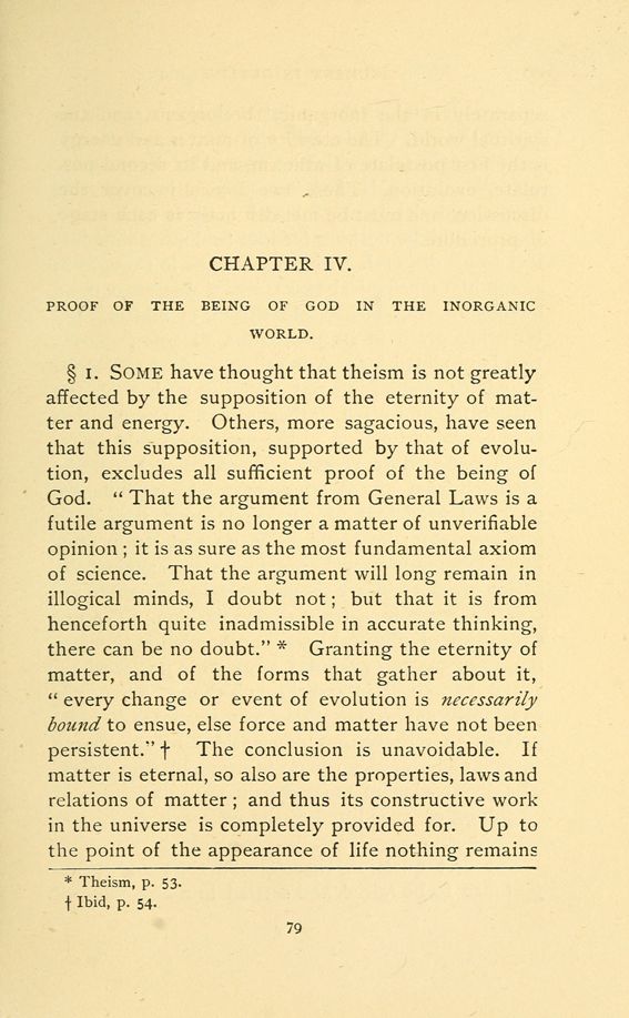 §1. SOME have thought that theism is not greatly affected by the supposition of the eternity of matter and energy. Others, more sagacious, have seen that this supposition, supported by that of evolution, excludes all sufficient proof of the being of God. "That the argument from General Laws is a futile argument is no longer a matter of unverifiable opinion; it is as sure as the most fundamental axiom of science. That the argument will long remain in illogical minds, I doubt not; but that it is from henceforth quite inadmissible in accurate thinking, there can be no doubt."* Granting the eternity of matter, and of the forms that gather about it, "every change or event of evolution is necessarily bound to ensue, else force and matter have not been persistent." + The conclusion is unavoidable. If matter is eternal, so also are the properties, laws and relations of matter; and thus its constructive work in the universe is completely provided for. Up to the point of the appearance of life nothing remains