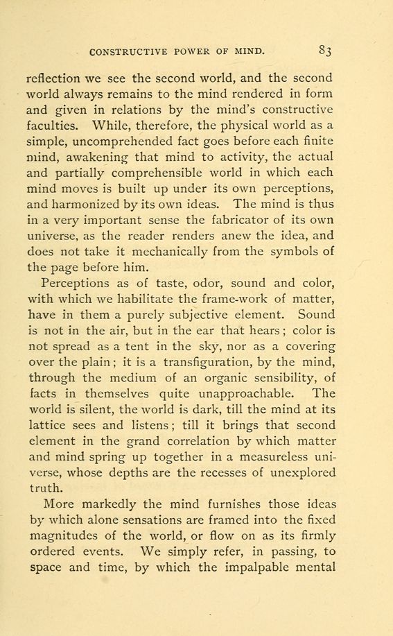 reflection we see the second world, and the second world always remains to the mind rendered in form and given in relations by the mind's constructive faculties. While, therefore, the physical world as a simple, uncomprehended fact goes before each finite mind, awakening that mind to activity, the actual and partially comprehensible world in which each mind moves is built up under its own perceptions, and harmonized by its own ideas. The mind is thus in a very important sense the fabricator of its own universe, as the reader renders anew the idea, and does not take it mechanically from the symbols of the page before him.