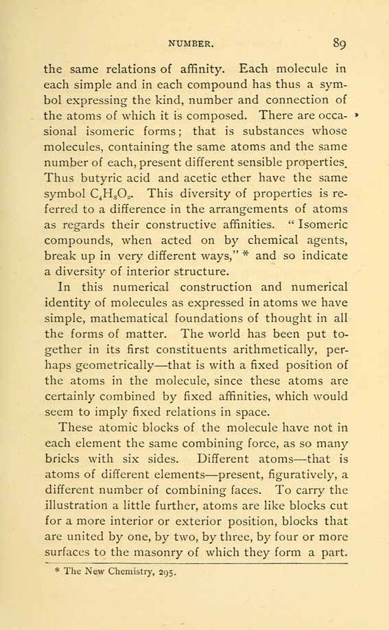 In this numerical construction and numerical identity of molecules as expressed in atoms we have simple, mathematical foundations of thought in all the forms of matter. The world has been put together in its first constituents arithmetically, perhaps geometrically --- that is with a fixed position of the atoms in the molecule, since these atoms are certainly combined by fixed affinities, which would seem to imply fixed relations in space.