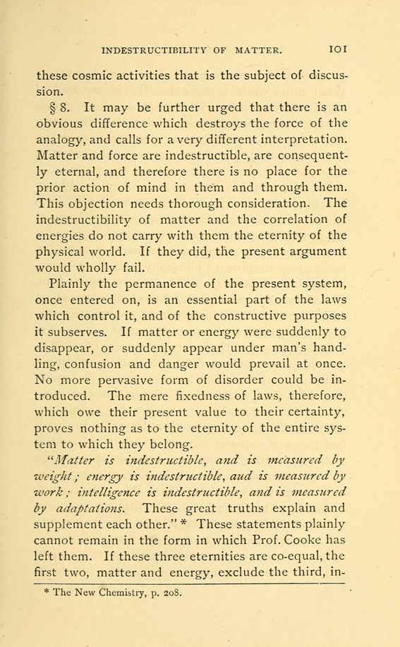 § 8. It may be further urged that there is an obvious difference which destroys the force of the analogy, and calls for a very different interpretation. Matter and force are indestructible, are consequently eternal, and therefore there is no place for the prior action of mind in them and through them. This objection needs thorough consideration. The indestructibility of matter and the correlation of energies do not carry with them the eternity of the physical world. If they did, the present argument would wholly fail.