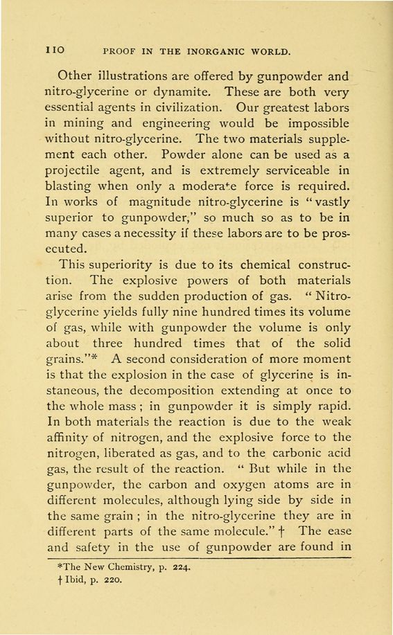 This superiority is due to its chemical construction. The explosive powers of both materials arise from the sudden production of gas. "Nitroglycerine yields fully nine hundred times its volume of gas, while with gunpowder the volume is only about three hundred times that of the solid grains."* A second consideration of more moment is that the explosion in the case of glycerine is instantaneous, the decomposition extending at once to the whole mass; in gunpowder it is simply rapid. In both materials the reaction is due to the weak affinity of nitrogen, and the explosive force to the nitrogen, liberated as gas, and to the carbonic acid gas, the result of the reaction. "But while in the gunpowder, the carbon and oxygen atoms are in different molecules, although lying side by side in the same grain; in the nitro-glycerine they are in different parts of the same molecule." + The ease and safety in the use of gunpowder are found in