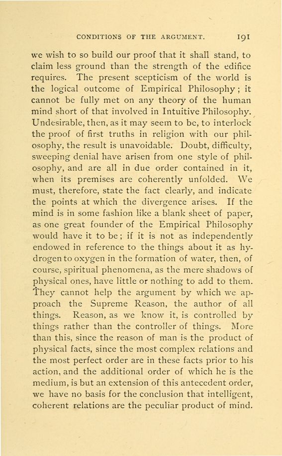 we wish to so build our proof that it shall stand, to claim less ground than the strength of the edifice requires. The present scepticism of the world is the logical outcome of Empirical Philosophy; it cannot be fully met on any theory of the human mind short of that involved in Intuitive Philosophy. Undesirable, then, as it may seem to be, to interlock the proof of first truths in religion with our philosophy, the result is unavoidable. Doubt, difficulty, sweeping denial have arisen from one style of philosophy, and are all in due order contained in it, when its premises are coherently unfolded. We must, therefore, state the fact clearly, and indicate the points at which the divergence arises. If the mind is in some fashion like a blank sheet of paper, as one great founder of the Empirical Philosophy would have it to be; if it is not as independently endowed in reference to the things about it as hydrogen to oxygen in the formation of water, then, of course, spiritual phenomena, as the mere shadows of physical ones, have little or nothing to add to them.