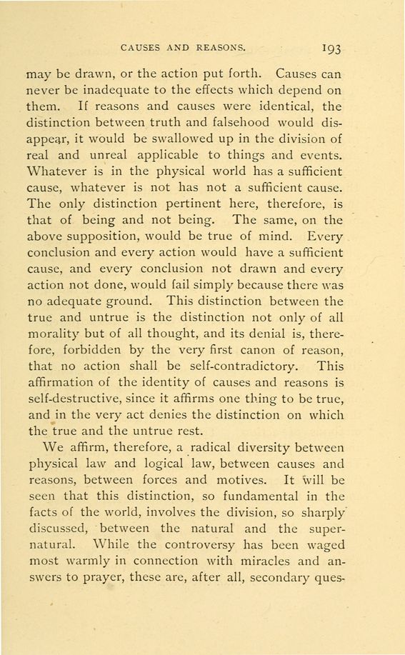 We affirm, therefore, a radical diversity between physical law and logical law, between causes and reasons, between forces and motives. It will be seen that this distinction, so fundamental in the facts of the world, involves the division, so sharply discussed, between the natural and the supernatural. While the controversy has been waged most warmly in connection with miracles and answers to prayer, these are, after all, secondary questions,