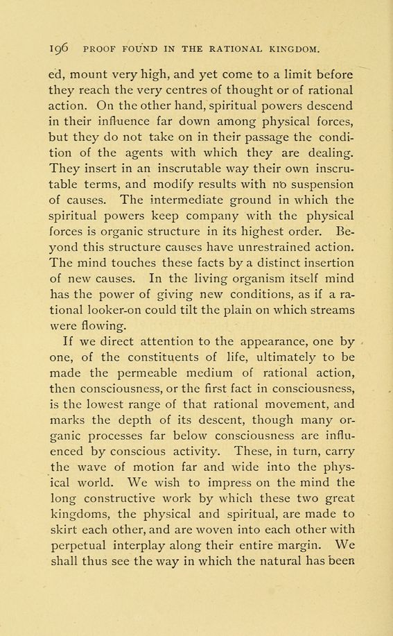 If we direct attention to the appearance, one by one, of the constituents of life, ultimately to be made the permeable medium of rational action, then consciousness, or the first fact in consciousness, is the lowest range of that rational movement, and marks the depth of its descent, though many organic processes far below consciousness are influenced by conscious activity. These, in turn, carry the wave of motion far and wide into the physical world. We wish to impress on the mind the long constructive work by which these two great kingdoms, the physical and spiritual, are made to skirt each other, and are woven into each other with perpetual interplay along their entire margin. We shall thus see the way in which the natural has been