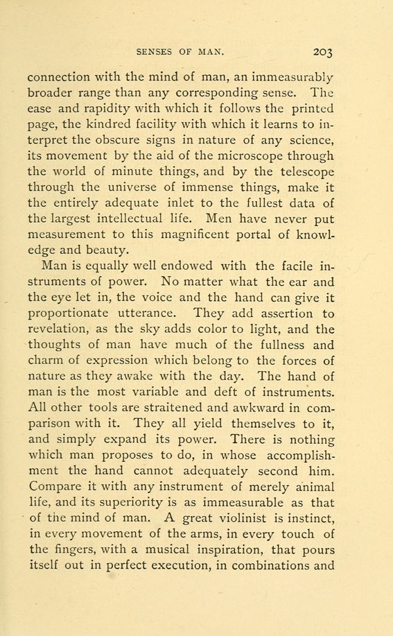 Man is equally well endowed with the facile instruments of power. No matter what the ear and the eye let in, the voice and the hand can give it proportionate utterance. They add assertion to revelation, as the sky adds color to light, and the thoughts of man have much of the fullness and charm of expression which belong to the forces of nature as they awake with the day. The hand of man is the most variable and deft of instruments. All other tools are straitened and awkward in comparison with it. They all yield themselves to it, and simply expand its power. There is nothing which man proposes to do, in whose accomplishment the hand cannot adequately second him. Compare it with any instrument of merely animal life, and its superiority is as immeasurable as that of the mind of man. A great violinist is instinct, in every movement of the arms, in every touch of the fingers, with a musical inspiration, that pours itself out in perfect execution, in combinations and