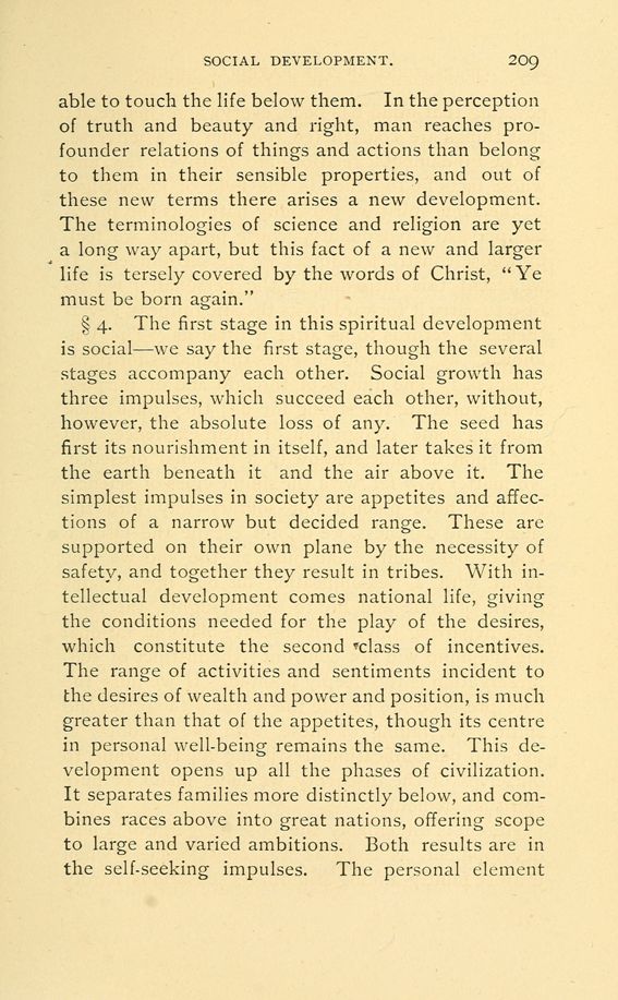 § 4. The first stage in this spiritual development is social --- we say the first stage, though the several stages accompany each other. Social growth has three impulses, which succeed each other, without, however, the absolute loss of any. The seed has first its nourishment in itself, and later takes it from the earth beneath it and the air above it. The simplest impulses in society are appetites and affections of a narrow but decided range. These are supported on their own plane by the necessity of safety, and together they result in tribes. With intellectual development comes national life, giving the conditions needed for the play of the desires, which constitute the second class of incentives. The range of activities and sentiments incident to the desires of wealth and power and position, is much greater than that of the appetites, though its centre in personal well-being remains the same. This development opens up all the phases of civilization. It separates families more distinctly below, and combines races above into great nations, offering scope to large and varied ambitions. Both results are in the self-seeking impulses. The personal element