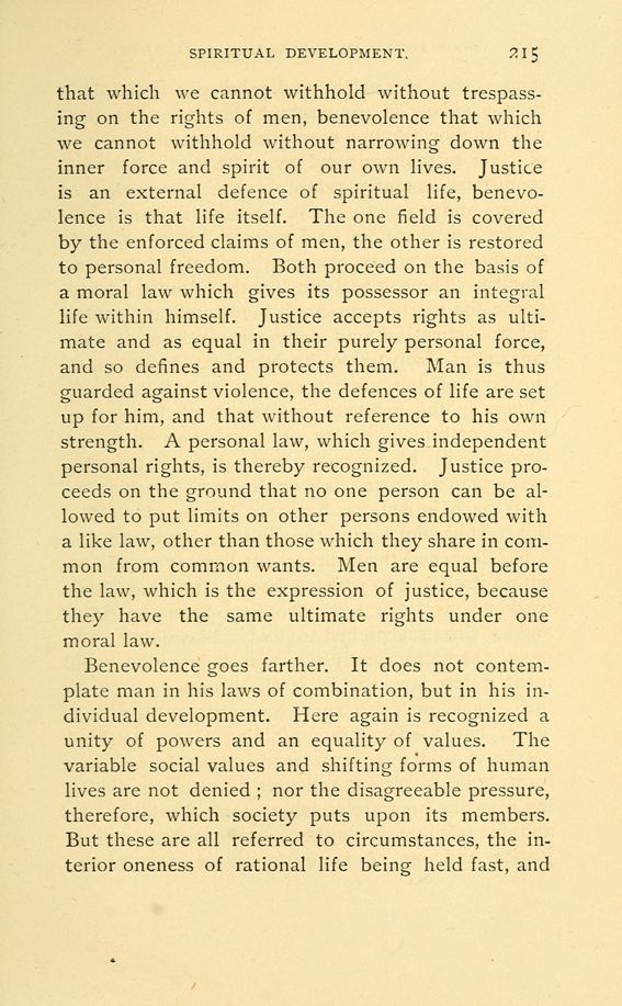 Benevolence goes farther. It does not contemplate man in his laws of combination, but in his individual development. Here again is recognized a unity of powers and an equality of values. The variable social values and shifting forms of human lives are not denied nor the disagreeable pressure, therefore, which society puts upon its members. But these are all referred to circumstances, the interior oneness of rational life being held fast, and