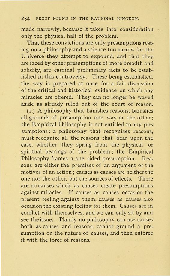 (1.) A philosophy that banishes reasons, banishes all grounds of presumption one way or the other; the Empirical Philosophy is not entitled to any presumptions: a philosophy that recognizes reasons, must recognize all the reasons that bear upon the case, whether they spring from the physical or spiritual bearings of the problem; the Empirical Philosophy frames a one sided presumption. Reasons are either the premises of an argument or the motives of an action; causes as causes are neither the one nor the other, but the sources of effects. There are no causes which as causes create presumptions against miracles. If causes as causes occasion the present feeling against them, causes as causes also occasion the existing feeling for them. Causes are in conflict with themselves, and we can only sit by and see the issue. Plainly no philosophy can use causes both as causes and reasons, cannot ground a presumption on the nature of causes, and then enforce it with the force of reasons.