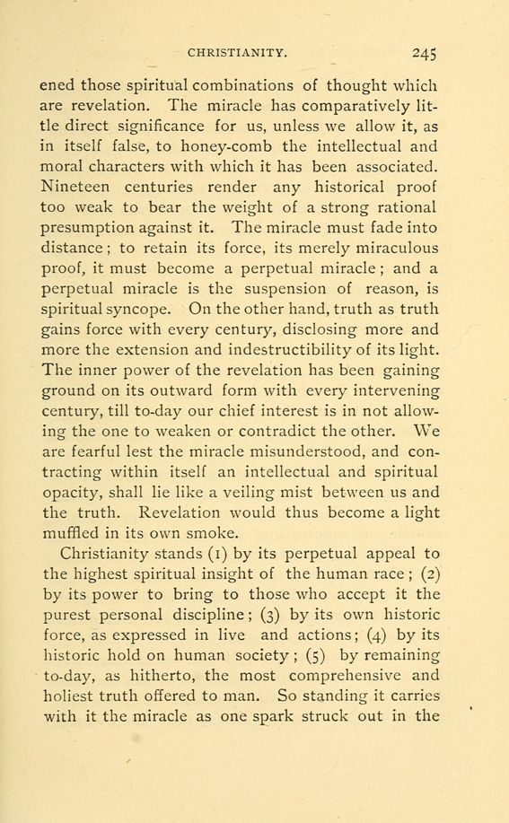 Christianity stands (1) by its perpetual appeal to the highest spiritual insight of the human race; (2) by its power to bring to those who accept it the purest personal discipline; (3) by its own historic force, as expressed in live and actions; (4) by its historic hold on human society; (5) by remaining to-day, as hitherto, the most comprehensive and holiest truth offered to man. So standing it carries with it the miracle as one spark struck out in the