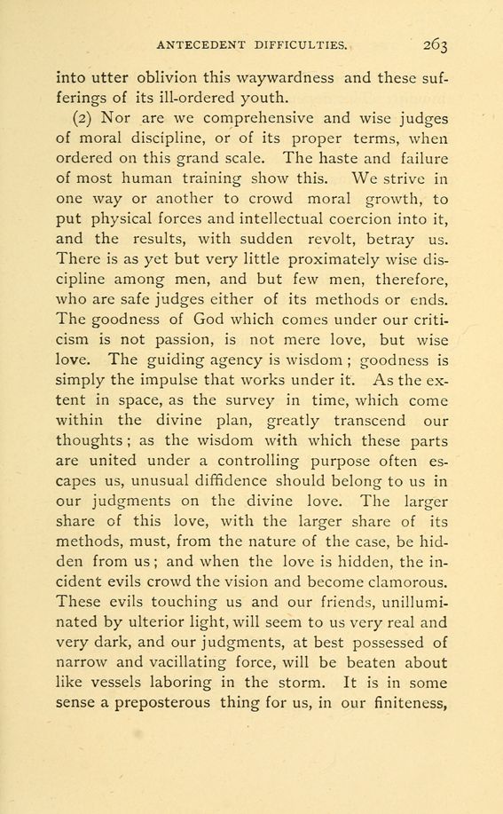 (2) Nor are we comprehensive and wise judges of moral discipline, or of its proper terms, when ordered on this grand scale. The haste and failure of most human training show this. We strive in one way or another to crowd moral growth, to put physical forces and intellectual coercion into it, and the results, with sudden revolt, betray us. There is as yet but very little proximately wise discipline among men, and but few men, therefore, who are safe judges either of its methods or ends. The goodness of God which comes under our criticism is not passion, is not mere love, but wise love. The guiding agency is wisdom; goodness is simply the impulse that works under it. As the extent in space, as the survey in time, which come within the divine plan, greatly transcend our thoughts; as the wisdom with which these parts are united under a controlling purpose often escapes us, unusual diffidence should belong to us in our judgments on the divine love. The larger share of this love, with the larger share of its methods, must, from the nature of the case, be hidden from us; and when the love is hidden, the incident evils crowd the vision and become clamorous. These evils touching us and our friends, unilluminated by ulterior light, will seem to us very real and very dark, and our judgments, at best possessed of narrow and vacillating force, will be beaten about like vessels laboring in the storm. It is in some sense a preposterous thing for us, in our finiteness,