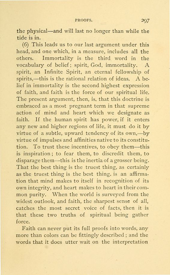 (6) This leads us to our last argument under this head, and one which, in a measure, includes all the others. Immortality is the third word in the vocabulary of belief; spirit, God, immortality. A spirit, an Infinite Spirit, an eternal fellowship of spirits, --- this is the rational relation of ideas. A belief in immortality is the second highest expression of faith, and faith is the force of our spiritual life. The present argument, then, is, that this doctrine is embraced as a most pregnant term in that supreme action of mind and heart which we designate as faith. If the human spirit has power, if it enters any new and higher regions of life, it must do it by virtue of a subtle, upward tendency of its own, --- by virtue of impulses and affinities native to its constitution. To trust these incentives, to obey them --- this is inspiration; to fear them, to discredit them, to disparage them --- this is the inertia of a grosser being. That the best thing is the truest thing, as certainly as the truest thing is the best thing, is an affirmation that mind makes to itself in recognition of its own integrity, and heart makes to heart in their common purity. When the world is surveyed from the widest outlook, and faith, the sharpest sense of all, catches the most secret voice of facts, then it is that these two truths of spiritual being gather force.