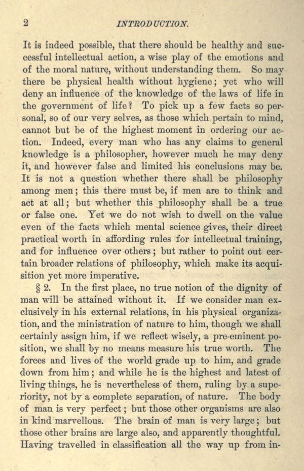 It is indeed possible, that there should be healthy and successful intellectual action, a wise play of the emotions and of the moral nature, without understanding them. So may there be physical health without hygiene; yet who will deny an influence of the knowledge of the laws of life in the government of life? To pick up a few facts so personal, so of our very selves, as those which pertain to mind, cannot but be of the highest moment in ordering our action. Indeed, every man who has any claims to general knowledge is a philosopher, however much he may deny it, and however false and limited his conclusions may be. It is not a question whether there shall be philosophy among men; this there must be, if men are to think and act at all; but whether this philosophy shall be a true or false one. Yet we do not wish to dwell on the value even of the facts which mental science gives, their direct practical worth in affording rules for intellectual training, and for influence over others; but rather to point out certain broader relations of philosophy, which make its acquisition yet more imperative.