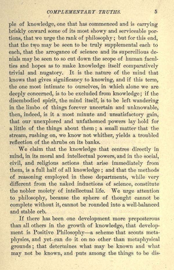 of knowledge, one that has commenced and is carrying briskly onward some of its most showy and serviceable portions, that we urge the rank of philosophy; but for this end, that the two may be seen to be truly supplemental each to each, that the arrogance of science and its supercilious denials may be seen to so cut down the scope of human faculties and hopes as to make knowledge itself comparatively trivial and nugatory. It is the nature of the mind that knows that gives significancy to knowing, and if this term, the one most intimate to ourselves, in which alone we are deeply concerned, is to be excluded from knowledge; if the disembodied spirit, the mind itself, is to be left wandering in the limbo of things forever uncertain and unknowable, then, indeed, is it a most minute and unsatisfactory gain, that our unexplored and unfathomed powers lay hold for a little of the things about them; a small matter that the stream, rushing on, we know not whither, yields a troubled reflection of the shrubs on its banks.