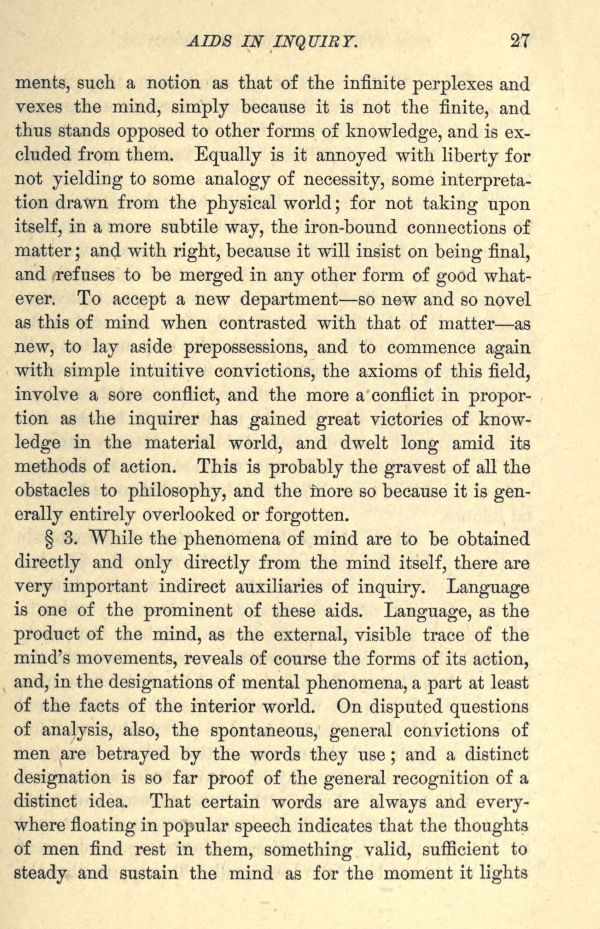 3. While the phenomena of mind are to be obtained directly and only directly from the mind itself, there are very important indirect auxiliaries of inquiry. Language is one of the prominent of these aids. Language, as the product of the mind, as the external, visible trace of the mind's movements, reveals of course the forms of its action, and, in the designations of mental phenomena, a part at least of the facts of the interior world. On disputed questions of analysis, also, the spontaneous, general convictions of men are betrayed by the words they use; and a distinct designation is so far proof of the general recognition of a distinct idea. That certain words are always and everywhere floating in popular speech indicates that the thoughts of men find rest in them, something valid, sufficient to steady and sustain the mind as for the moment it lights