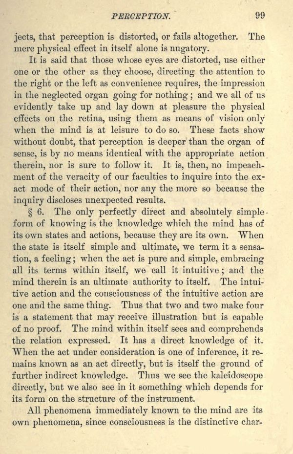 6. The only perfectly direct and absolutely simple form of knowing is the knowledge which the mind has of its own states and actions, because they are its own. When the state is itself simple and ultimate, we term it a sensation, a feeling; when the act is pure and simple, embracing all its terms within itself, we call it intuitive; and the mind therein is an ultimate authority to itself. The intuitive action and the consciousness of the intuitive action are one and the same thing. Thus that two and two make four is a statement that may receive illustration but is capable of no proof. The mind within itself sees and comprehends the relation expressed. It has a direct knowledge of it. When the act under consideration is one of inference, it remains known as an act directly, but is itself the ground of further indirect knowledge. Thus we see the kaleidoscope directly, but we also see in it something which depends for its form on the structure of the instrument.