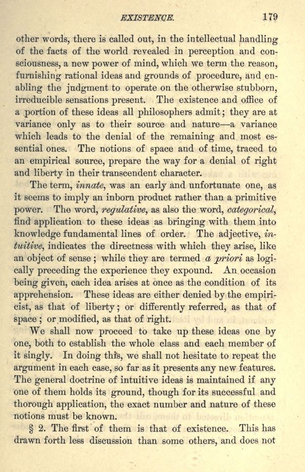 The term, innate, was an early and unfortunate one, as it seems to imply an inborn product rather than a primitive power. The word, regulative, as also the word, categorical, find application to these ideas as bringing with them into knowledge fundamental lines of order. The adjective, intuitive, indicates the directness with which they arise, like an object of sense; while they are termed a priori as logically preceding the experience they expound. An occasion being given, each idea arises at once as the condition of its apprehension. These ideas are either denied by the empiricist, as that of liberty; or differently referred, as that of space; or modified, as that of right.