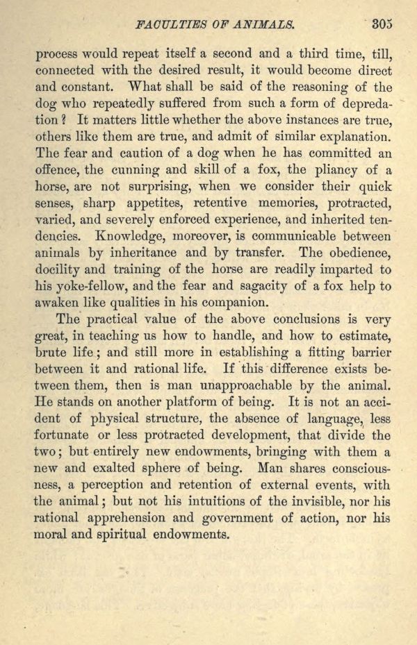 The practical value of the above conclusions is very great, in teaching us how to handle, and how to estimate, brute life; and still more in establishing a fitting barrier between it and rational life. If this difference exists between them, then is man unapproachable by the animal. He stands on another platform of being. It is not an accident of physical structure, the absence of language, less fortunate or less protracted development, that divide the two; but entirely new endowments, bringing with them a new and exalted sphere of being. Man shares consciousness, a perception and retention of external events, with the animal; but not his intuitions of the invisible, nor his rational apprehension and government of action, nor his moral and spiritual endowments.