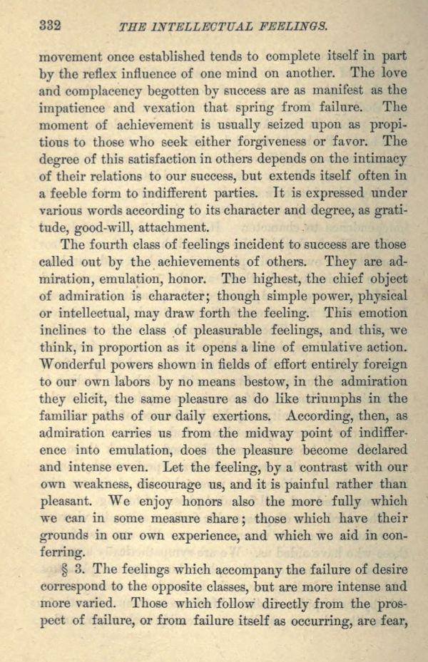 The fourth class of feelings incident to success are those called out by the achievements of others. They are admiration, emulation, honor. The highest, the chief object of admiration is character; though simple power, physical or intellectual, may draw forth the feeling. This emotion inclines to the class of pleasurable feelings, and this, we think, in proportion as it opens a line of emulative action. Wonderful powers shown in fields of effort entirely foreign to our own labors by no means bestow, in the admiration they elicit, the same pleasure as do like triumphs in the familiar paths of our daily exertions. According, then, as admiration carries us from the midway point of indifference into emulation, does the pleasure become declared and intense even. Let the feeling, by a contrast with our own weakness, discourage us, and it is painful rather than pleasant. We enjoy honors also the more fully which we can in some measure share; those which have their grounds in our own experience, and which we aid in conferring.