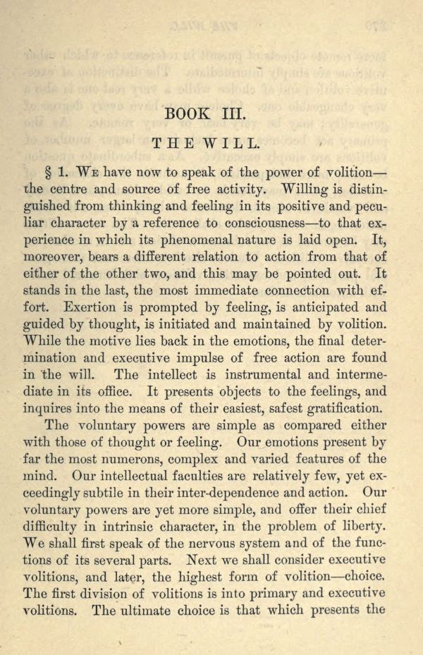 1. WE have now to speak of the power of volition the centre and source of free activity. Willing is distinguished from thinking and feeling in its positive and peculiar character by a reference to consciousness to that experience in which its phenomenal nature is laid open. It, moreover, bears a different relation to action from that of either of the other two, and this may be pointed out. It stands in the last, the most immediate connection with effort. Exertion is prompted by feeling, is anticipated arid guided by thought, is initiated and maintained by volition. While the motive lies back in the emotions, the final determination and executive impulse of free action are found in "the will. The intellect is instrumental and intermediate in its office. It presents objects to the feelings, and inquires into the means of their easiest, safest gratification.