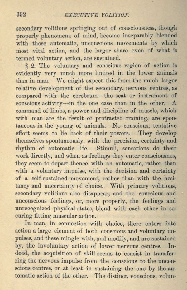 2. The voluntary and conscious region of action is evidently very much more limited in the lower animals than in man. We might expect this from the much larger relative development of the secondary, nervous centres, as compared with the cerebrum the seat or instrument of conscious activity in the one case than in the other. A command of limbs, a power and discipline of muscle, which with man are the result of protracted training, are spontaneous in the young of animals. No conscious, tentative effort seems to lie back of their powers. They develop themselves spontaneously, with the precision, certainty and rhythm of automatic life. Stimuli, sensations do their work directly, and when as feelings they enter consciousness, they seem to depart thence with an automatic, rather than with a voluntary impulse, with the decision and certainty of a self -sustained movement, rather than with the hesitancy and uncertainty of choice. With primary volitions, secondary volitions also disappear, and the conscious and unconscious feelings, or, more properly, the feelings and unrecognized physical states, blend with each other in securing fitting muscular action.