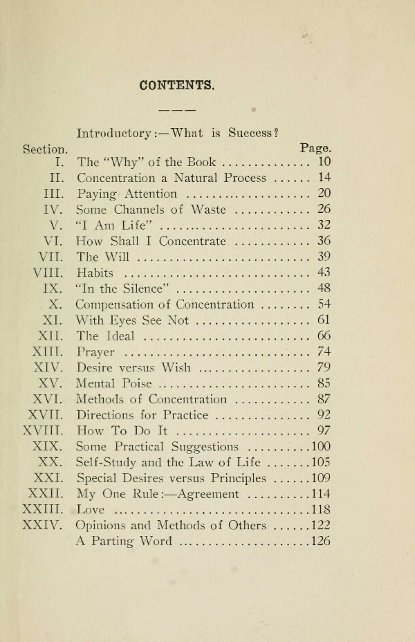 Introductory - What is Success? - The "Why" of the Book - Concentration a Natural Process - Paying Attention - Some Channels of Waste - "I Am Life" - How Shall I Concentrate - The Will - Habits - "In the Silence" - Compensation of Concentration - With Eyes See Not - The Ideal - Prayer - Desire versus Wish - Mental Poise - Methods of Concentration - Directions for Practice - How To Do It - Some Practical Suggestions - Self-Study and the Law of Life - Special Desires versus Principles - My One Rule:-Agreement - Love - Opinions and Methods of Others - A Parting Word -