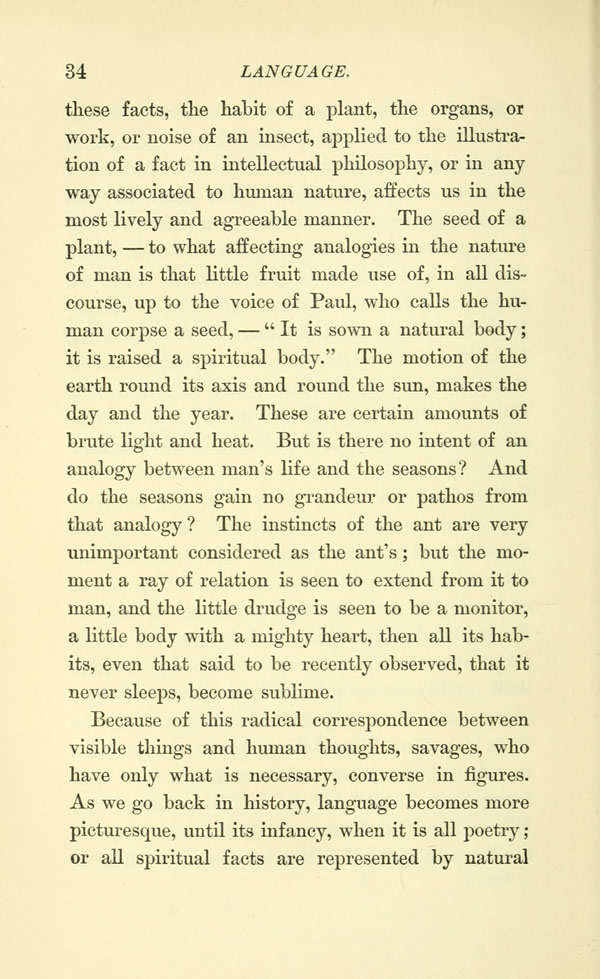 these facts, the habit of a plant, the organs, or work, or noise of an insect, applied to the illustration of a fact in intellectual philosophy, or in any way associated to human nature, affects us in the most lively and agreeable manner. The seed of a plant, --- to what affecting analogies in the nature of man is that little fruit made use of, in all discourse, up to the voice of Paul, who calls the human corpse a seed, --- "It is sown a natural body; it is raised a spiritual body." The motion of the earth round its axis and round the sun, makes the day and the year. These are certain amounts of brute light and heat. But is there no intent of an analogy between man's life and the seasons? And do the seasons gain no grandeur or pathos from that analogy? The instincts of the ant are very unimportant considered as the ant's; but the moment a ray of relation is seen to extend from it to man, and the little drudge is seen to be a monitor, a little body with a mighty heart, then all its habits, even that said to be recently observed, that it never sleeps, become sublime.