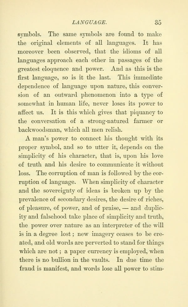 A man's power to connect his thought with its proper symbol, and so to utter it, depends on the simplicity of his character, that is, upon his love of truth and his desire to communicate it without loss. The corruption of man is followed by the corruption of language. When simplicity of character and the sovereignty of ideas is broken up by the prevalence of secondary desires, the desire of riches, of pleasure, of power, and of praise, --- and duplicity and falsehood take place of simplicity and truth, the power over nature as an interpreter of the will is in a degree lost; new imagery ceases to be created, and old words are perverted to stand for things which are not; a paper currency is employed, when there is no bullion in the vaults. In due time the fraud is manifest, and words lose all power to stimulate