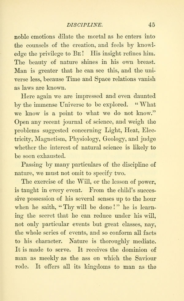 The exercise of the Will, or the lesson of power, is taught in every event. From the child's successive possession of his several senses up to the hour when he saith, " Thy will be done! " he is learning the secret that he can reduce under his will, not only particular events but great classes, nay, the whole series of events, and so conform all facts to his character. Nature is thoroughly mediate. It is made to serve. It receives the dominion of man as meekly as the ass on which the Saviour rode. It offers all its kingdoms to man as the