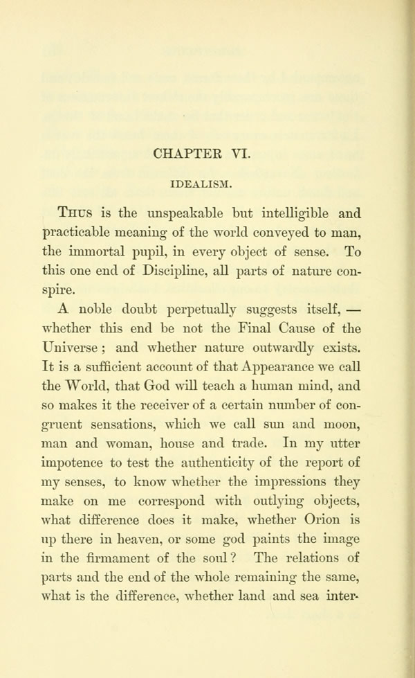 A noble doubt perpetually suggests itself, --whether this end be not the Final Cause of the Universe; and whether nature outwardly exists. It is a sufficient account of that Appearance we call the World, that God will teach a human mind, and so makes it the receiver of a certain number of congruent sensations, which we call sun and moon, man and woman, house and trade. In my utter impotence to test the authenticity of the report of my senses, to know whether the impressions they make on me correspond with outlying objects, what difference does it make, whether Orion is up there in heaven, or some god paints the image in the firmament of the soul? The relations of parts and the end of the whole remaining the same, what is the difference, whether land and sea interact,