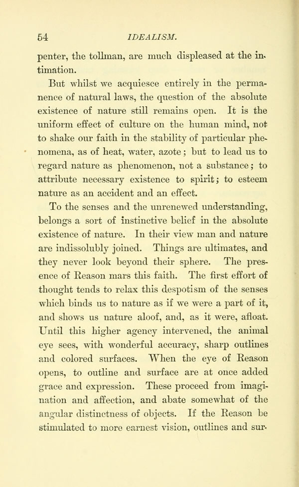 But whilst we acquiesce entirely in the permanence of natural laws, the question of the absolute existence of nature still remains open. It is the uniform effect of culture on the human mind, not to shake our faith in the stability of particular phenomena., as of heat, water, azote; but to lead us to regard nature as phenomenon, not a substance; to attribute necessary existence to spirit; to esteem nature as an accident and an effect.