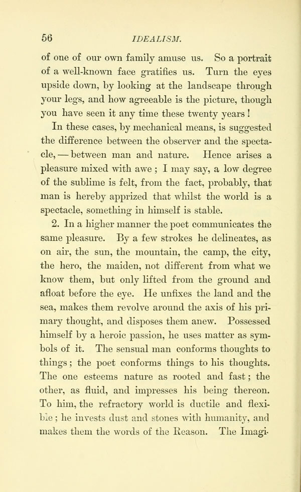 2. In a higher manner the poet communicates the same pleasure. By a few strokes he delineates, as on air, the sun, the mountain, the camp, the city, the hero, the maiden, not different from what we know them, but only lifted from the ground and afloat before the eye. He unfixes the land and the sea, makes them revolve around the axis of his primary thought, and disposes them anew. Possessed himself by a heroic passion, lie uses matter as symbols of it. The sensual man conforms thoughts to things; the poet conforms things to his thoughts.