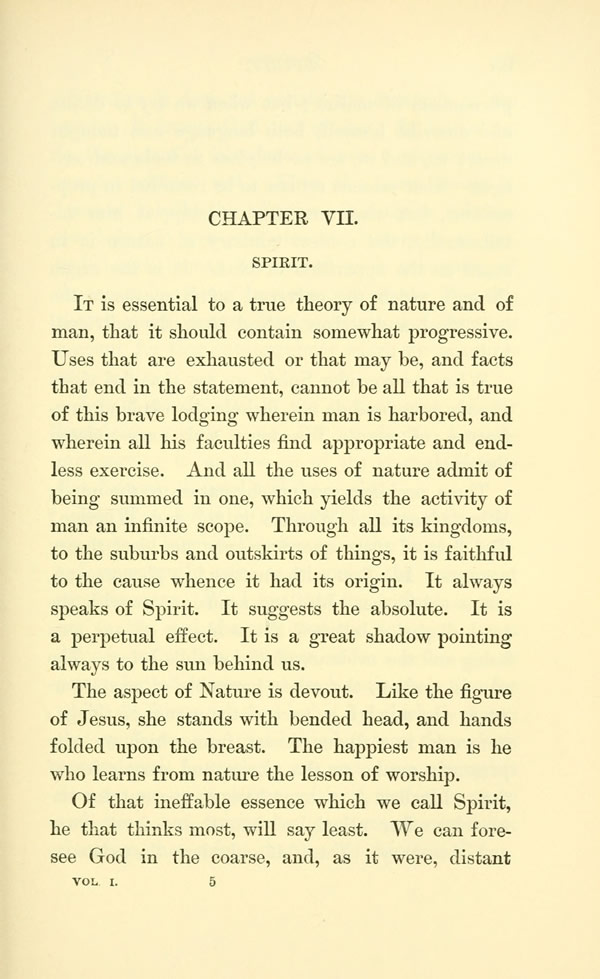IT is essential to a true theory of nature and of man, that it should contain somewhat progressive. Uses that are exhausted or that may be, and facts that end in the statement, cannot be all that is true of this brave lodging wherein man is harbored, and wherein all his faculties find appropriate and endless exercise. And all the uses of nature admit of being summed in one, which yields the activity of man an infinite scope. Through all its kingdoms, to the suburbs and outskirts of things, it is faithful to the cause whence it had its origin. It always speaks of Spirit. It suggests the absolute. It is a perpetual effect. It is a great shadow pointing always to the sun behind us.
