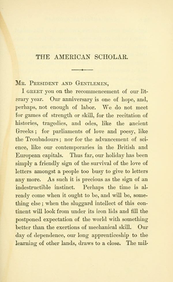 I GREET you on the recommencement of our literary year. Our anniversary is one of hope, and, perhaps, not enough of labor. We do not meet for games of strength or skill, for the recitation of histories, tragedies, and odes, like the ancient Greeks; for parliaments of love and poesy, like the Troubadours; nor for the advancement of science, like our contemporaries in the British and European capitals. Thus far, our holiday has been simply a friendly sign of the survival of the love of letters amongst a people too busy to give to letters any more. As such it is precious as the sign of an indestructible instinct. Perhaps the time is already come when it ought to be, and will be, something else; when the sluggard intellect of this continent will look from under its iron lids and fill the postponed expectation of the world with something better than the exertions of mechanical skill. Our day of dependence, our long apprenticeship to the learning of other lands, draws to a close. The millions