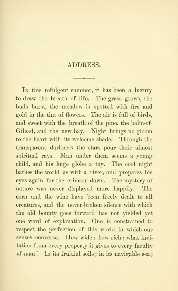 IN this refulgent summer, it has been a luxury to draw the breath of life. The grass grows, the buds burst, the meadow is spotted with fire and gold in the tint of flowers. The air is full of birds, and sweet with the breath of the pine, the balm-of-Gilead, and the new hay. Night brings no gloom to the heart with its welcome shade. Through the transparent darkness the stars pour their almost spiritual rays. Man under them seems a young child, and his huge globe a toy. The cool night bathes the world as with a river, and prepares his eyes again for the crimson dawn. The mystery of nature was never displayed more happily. The corn and the wine have been freely dealt to all creatures, and the never-broken silence with which the old bounty goes forward has not yielded yet one word of explanation. One is constrained to respect the perfection of this world in which oar senses converse. How wide; how rich; what invitation from every property it gives to every faculty of man! In its fruitful soils; in its navigable sea;