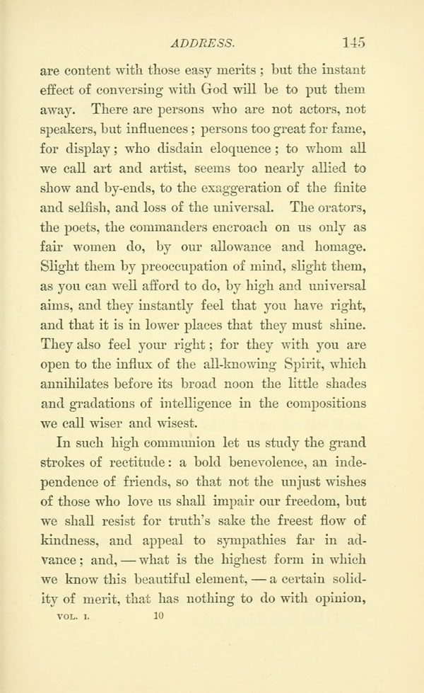are content with those easy merits; but the instant effect of conversing with God will be to put them away. There are persons who are not actors, not speakers, but influences; persons too great for fame, for display; who disdain eloquence; to whom all we call art and artist, seems too nearly allied to show and by-ends, to the exaggeration of the finite and selfish, and loss of the universal. The orators, the poets, the commanders encroach on us only as fair women do, by our allowance and homage. Slight them by preoccupation of mind, slight them, as you can well afford to do, by high and universal aims, and they instantly feel that you have right, and that it is in lower places that they must shine. They also feel your right; for they with you are open to the influx of the all-knowing Spirit, which annihilates before its broad noon the little shades and gradations of intelligence in the compositions we call wiser and wisest.