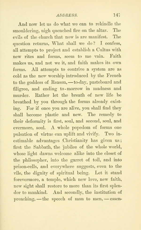 And now let us do what we can to rekindle the smouldering, nigh quenched fire on the altar. The evils of the church that now is are manifest. The question returns, What shall we do? I confess, all attempts to project and establish a Cultus with new rites and forms, seem to me vain. Faith makes us, and not we it, and faith makes its own forms. All attempts to contrive a system are as cold as the new worship introduced by the French to the goddess of Reason, --- to-day, pasteboard and filigree, and ending to-morrow in madness and murder. Rather let the breath of new life be breathed by you through the forms already existing. For if once you are alive, you shall find they shall become plastic and new. The remedy to their deformity is first, soul, and second, soul, and evermore, soul. A whole popedom of forms one pulsation of virtue can uplift and vivify. Two inestimable advantages Christianity has given us; first the Sabbath, the jubilee of the whole world, whose light dawns welcome alike into the closet of the philosopher, into the garret of toil, and into prison-cells, and everywhere suggests, even to the vile, the dignity of spiritual being. Let it stand forevermore, a temple, which new love, new faith, new sight shall restore to more than its first splendor to mankind. And secondly, the institution of preaching, --- the speech of man to men, --- essentially