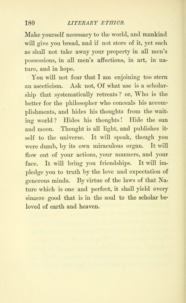 You will not fear that I am enjoining too stern an asceticism. Ask not, Of what use is a scholarship that systematically retreats? or, Who is the better for the philosopher who conceals his accomplishments, and hides his thoughts from the waiting world? Hides his thoughts! Hide the sun and moon. Thought is all light, and publishes itself to the universe. It will speak, though you were dumb, by its own miraculous organ. It will flow out of your actions, your manners, and your face. It will bring you friendships. It will impledge you to truth by the love and expectation of generous minds. By virtue of the laws of that Nature which is one and perfect, it shall yield every sincere good that is in the soul to the scholar beloved of earth and heaven.