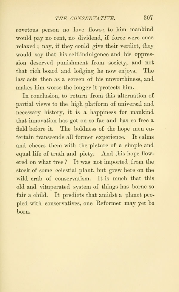 In conclusion, to return from this alternation of partial views to the high platform of universal and necessary history, it is a happiness for mankind that innovation has got on so far and has so free a field before it. The boldness of the hope men entertain transcends all former experience. It calms and cheers them with the picture of a simple and equal life of truth and piety. And this hope flowered on what tree? It was not imported from the stock of sonic celestial plant, but grew here on the wild crab of conservatism. It is much that this old and vituperated system of things has borne so fair a child. It predicts that amidst a planet peopled with conservatives, one Reformer may yet be born,