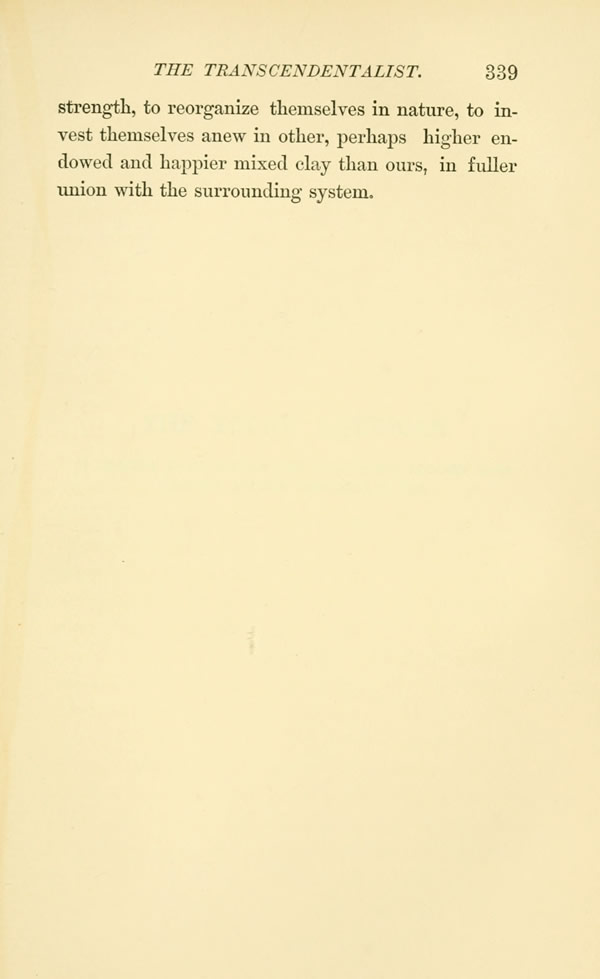 strength, to reorganize themselves in nature, to invest themselves anew in other, perhaps higher endowed and happier mixed clay than ours, in fuller union with the surrounding system.
