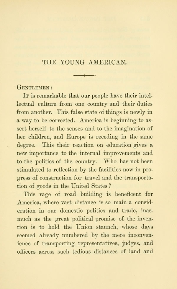 IT is remarkable that our people have their intellectual culture from one country and their duties from another. This false state of things is newly in a way to be corrected. America is beginning to assert herself to the senses and to the imagination of her children, and Europe is receding in the same degree. This their reaction on education gives a new importance to the internal improvements and to the politics of the country. Who has not been stimulated to reflection by the facilities now in progress of construction for travel and the transportation of goods in the United States?